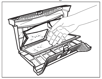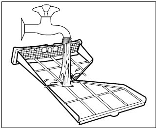 4. Limpe os filtros, remova o cotão do filtro e limpe o filtro sob a torneira de água quente. Limpe os filtros com a ponta dos dedos. Em seguida, seque o filtro com um pano.