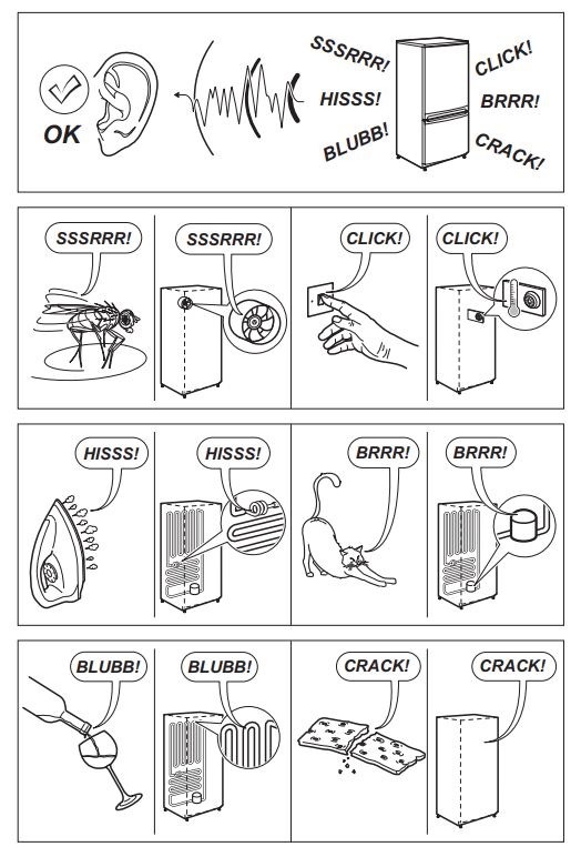 - O congelador ou frigorifico emite ruídos estranhos; zumbidos, estalos, cliques, vibrações, borbulhar e funcionando o motor.